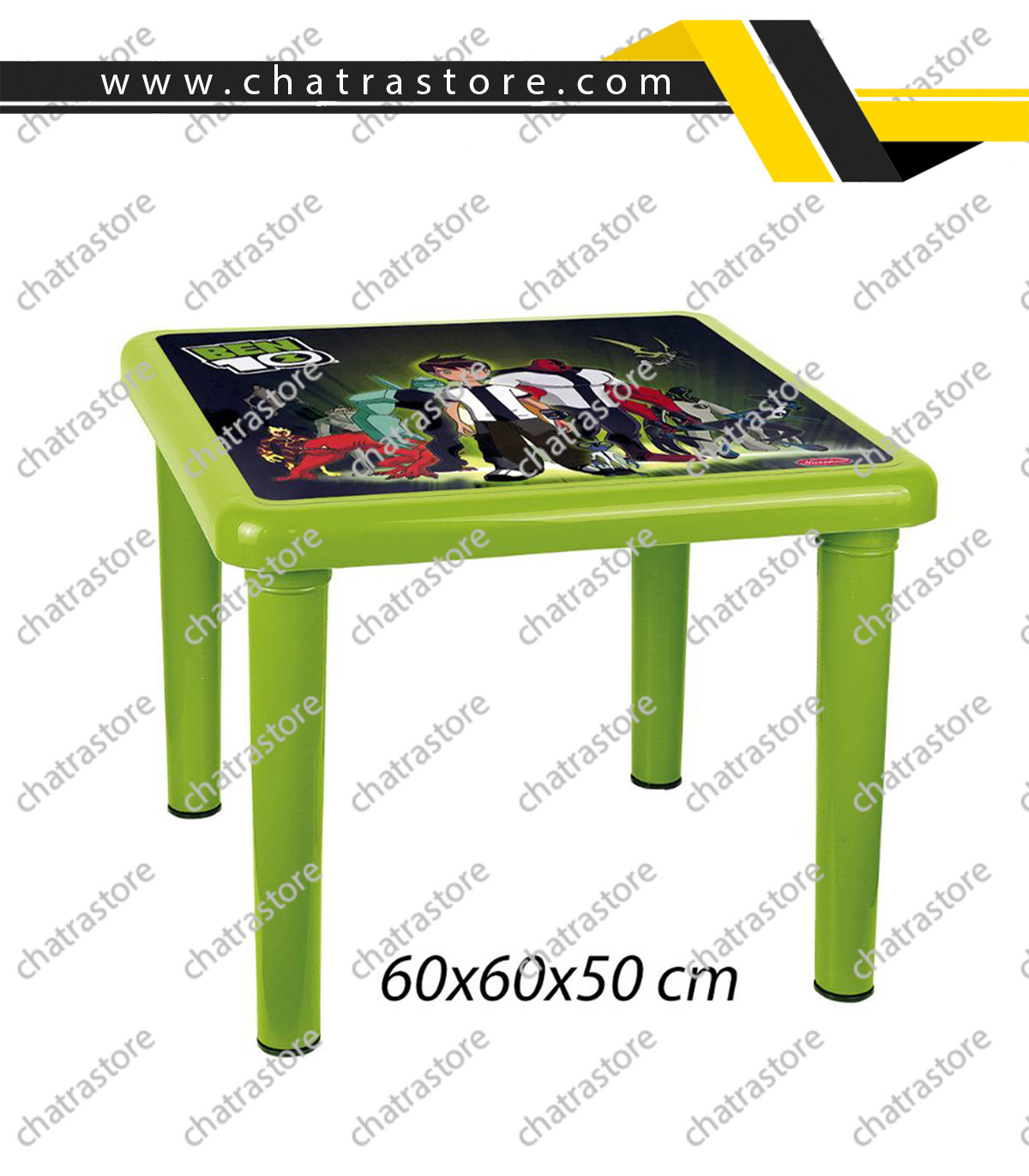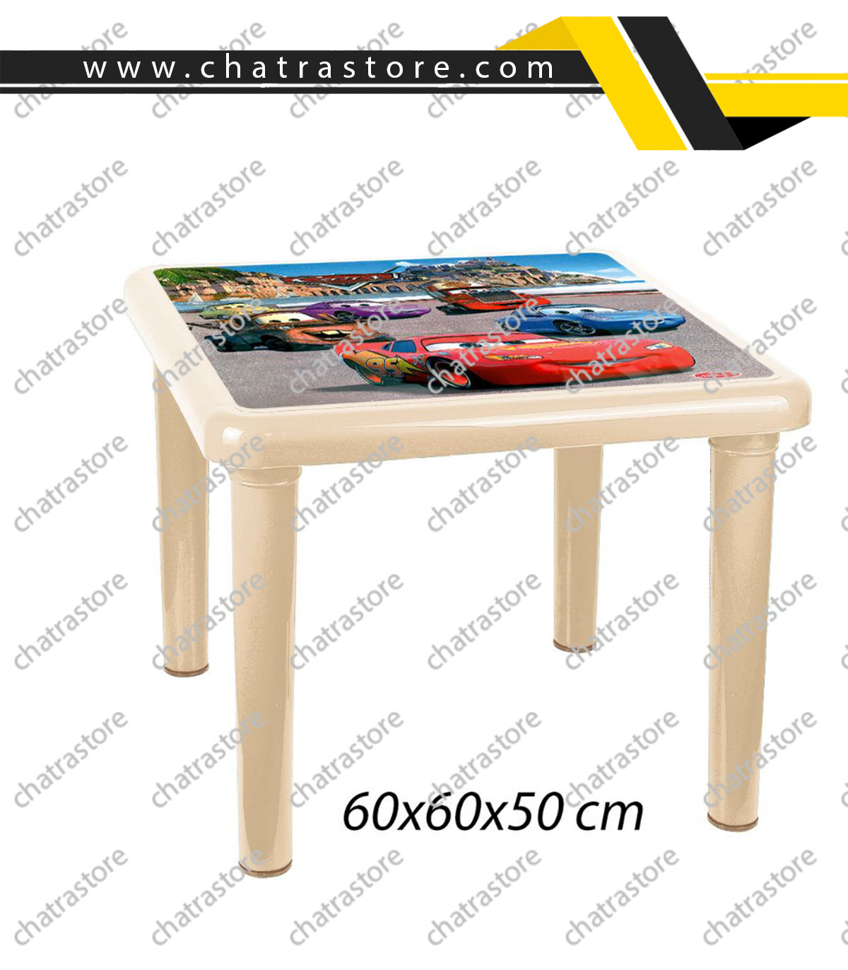 سطح رویی میز با طرح‌های کارتونی معروف و کودک‌پسند چاپ شده که باعث افزایش جذابیت و علاقه کودکان به استفاده از آن می‌شود. جنس میز از پلاستیک یا پلیمر مقاوم و غیرسمی ساخته شده و در برابر نور خورشید، رطوبت و ضربه مقاومت بالایی دارد.