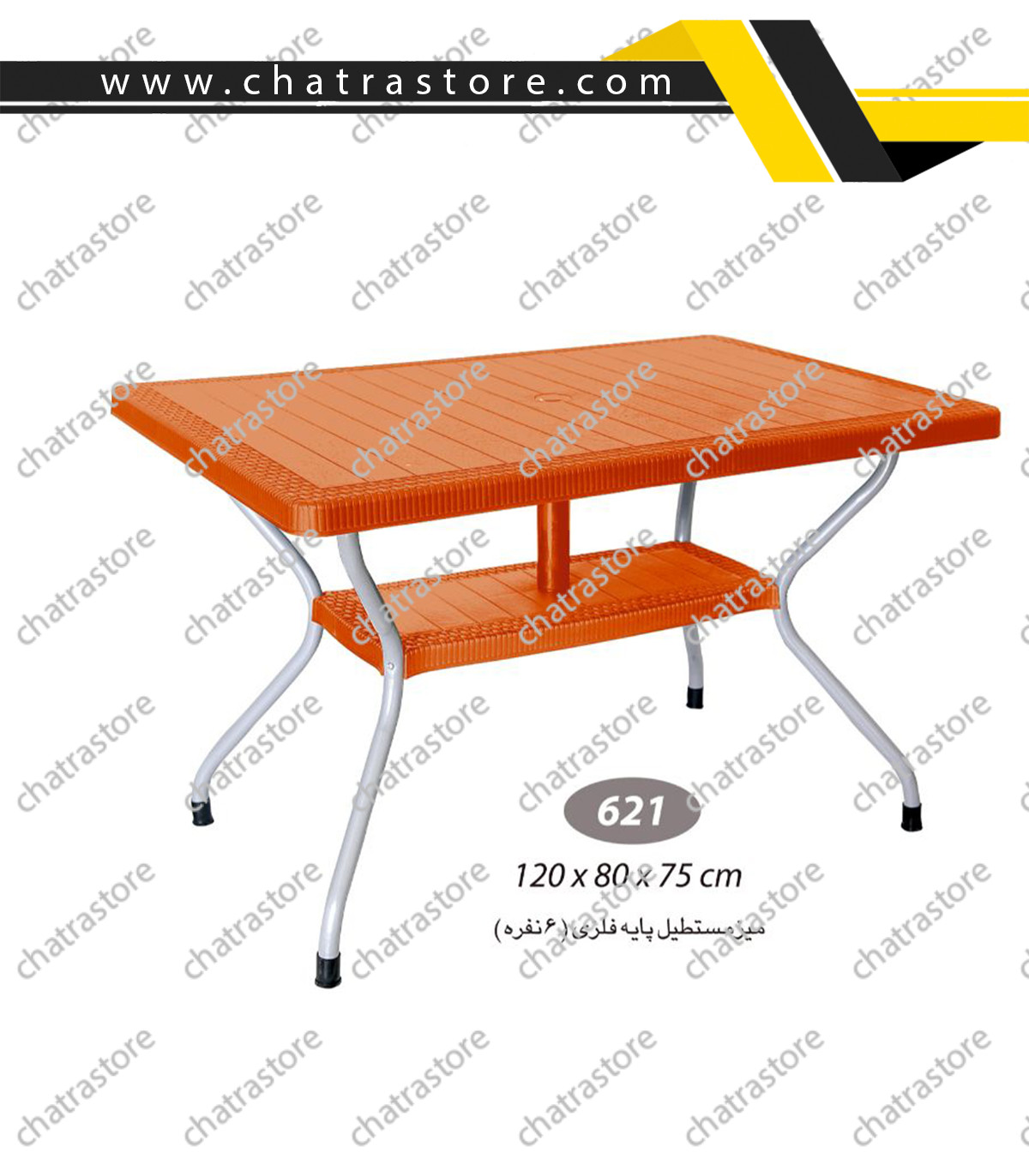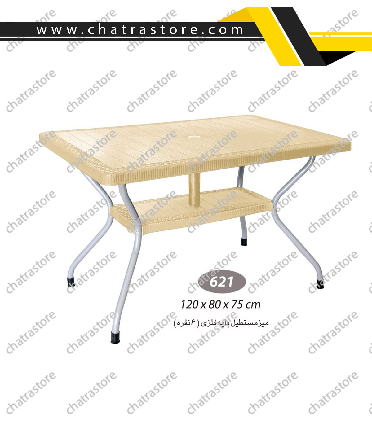 صفحه میز از پلاستیک یا پلیمر با بافت حصیری ساخته شده که علاوهبر زیبایی ظاهری، مقاومت بالایی در مقابل رطوبت، نور خورشید و خطوخش دارد. این ویژگی باعث شده میز 621 گزینهای عالی برای استفاده در باغها، حیاطها، تراسها، حیاط ویلا و فضاهای باز باشد.